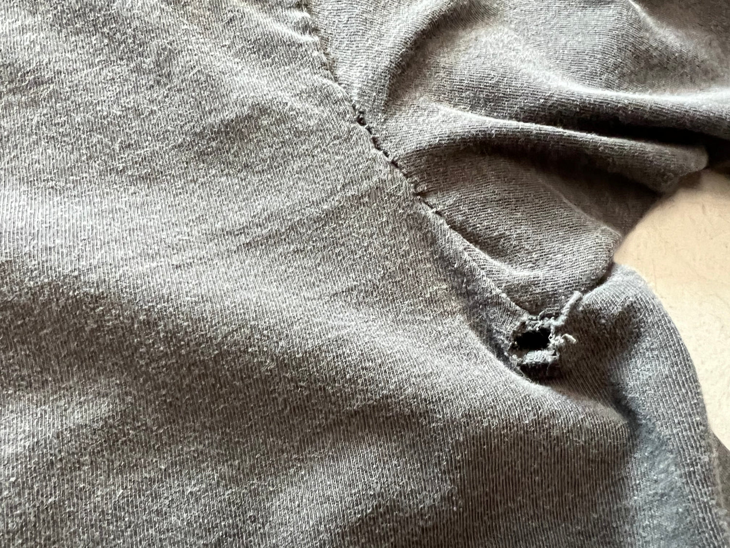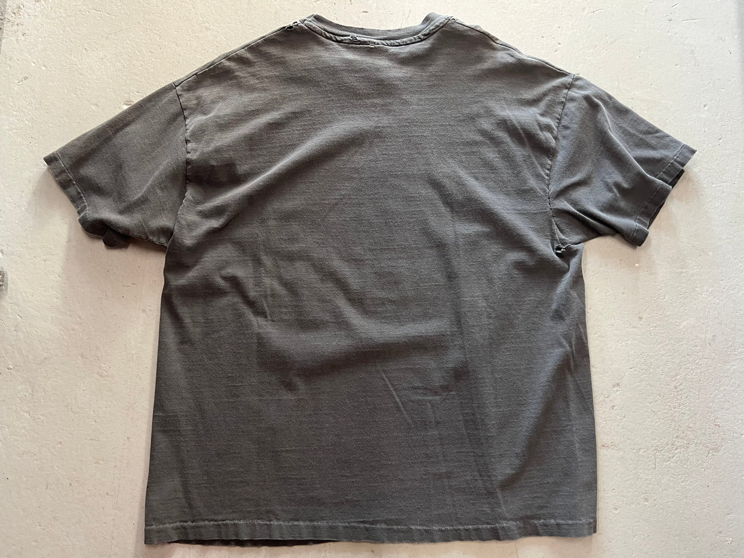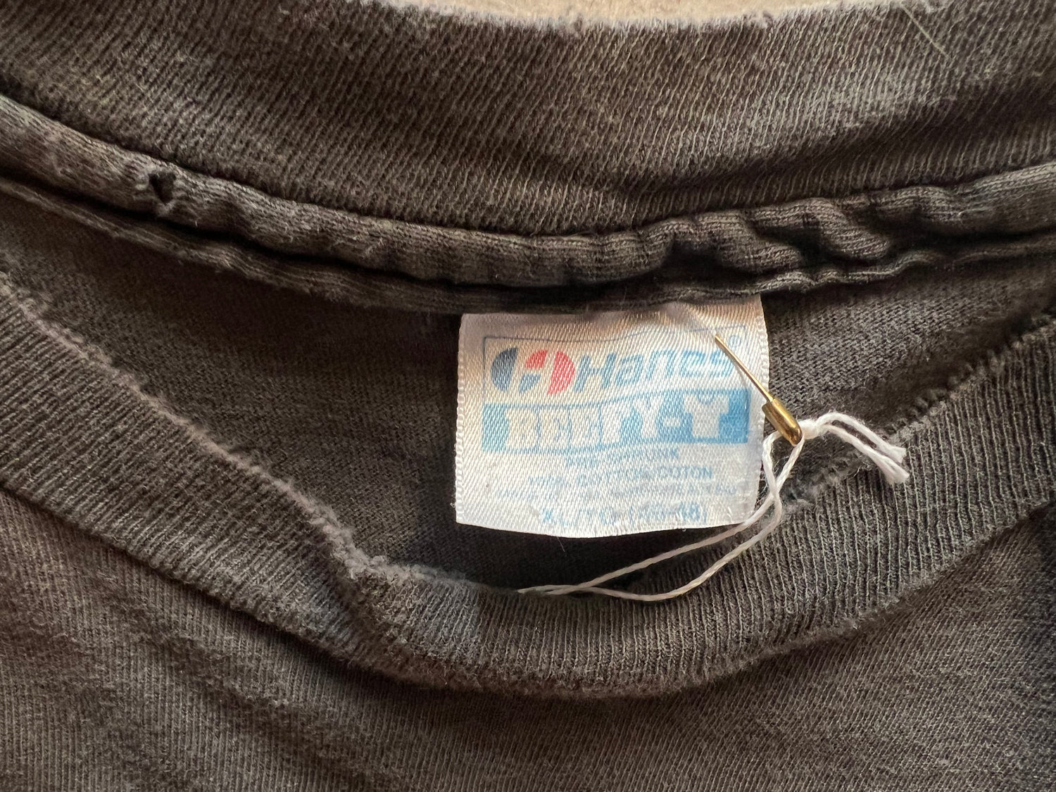 Condition: Fabric is nicely faded and soft. Some cracking and fading to the graphics. Holes in both armpits, splitting around neck/collar, as well as several small holes around the neck/collar